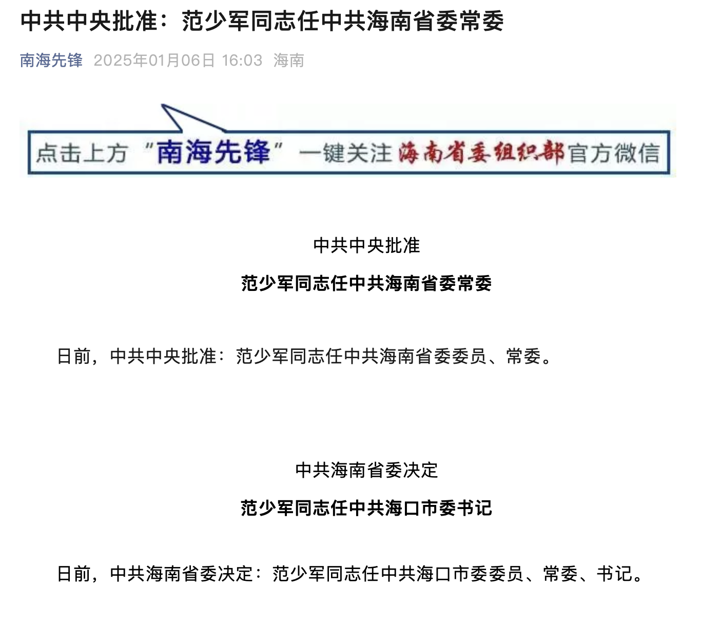 日前,中共海南省委决定:范少军同志任中共海口市委委员、常委、书记。