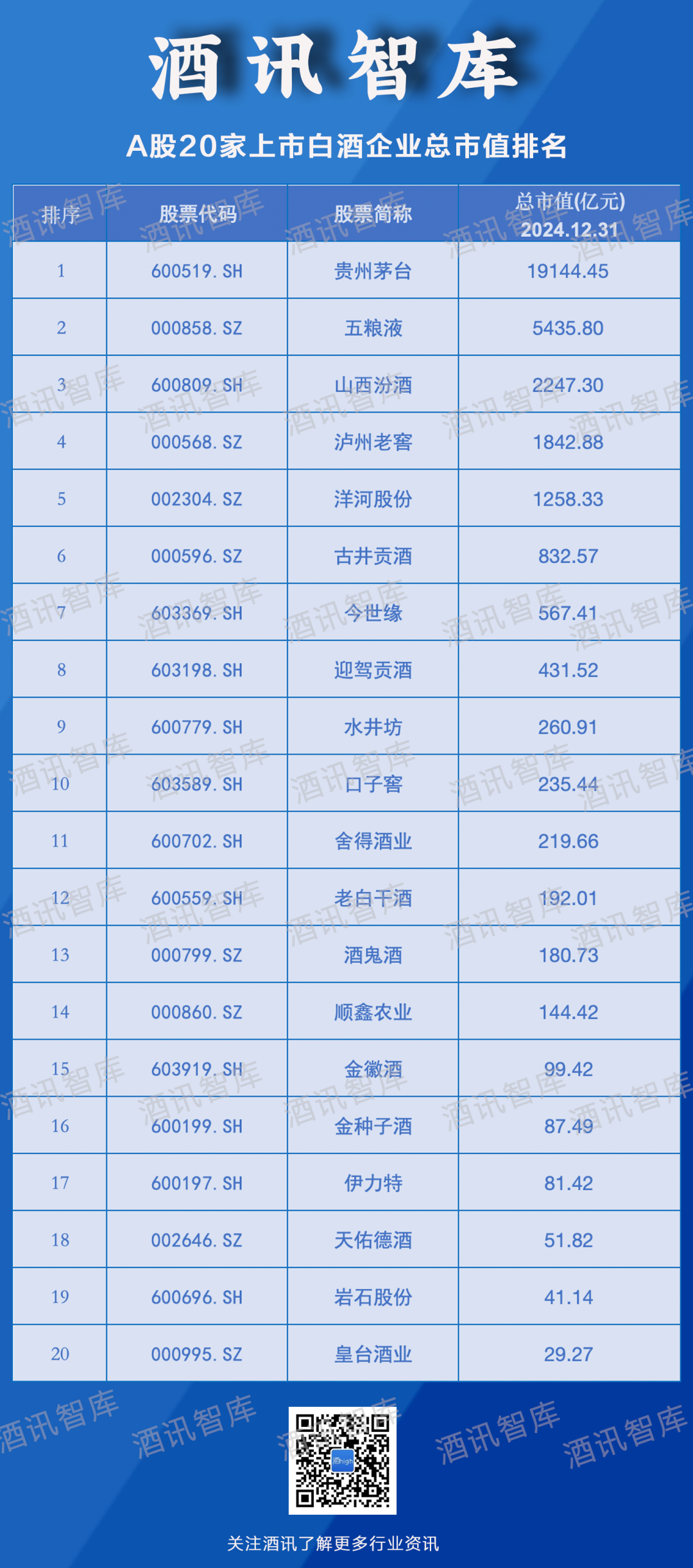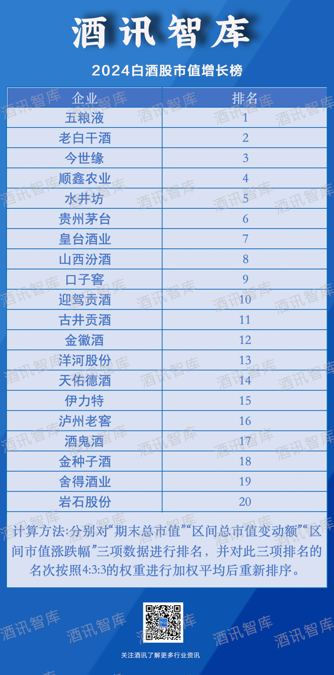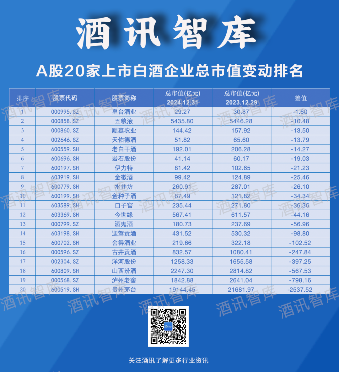 资本市场藏不住消费市场的波动,投资者的敏感神经时刻关注着风吹草动。酒讯智库针对2024年的白酒股市值表现进行梳理,从市值变动、市值涨跌等纬度,观察白酒股2024年的成长情况,制作了“2024白酒股市值增长榜”(下称“市值增长榜”),以市值增长情况探索白酒资本市场的动荡本因,展望白酒行业发展趋势。