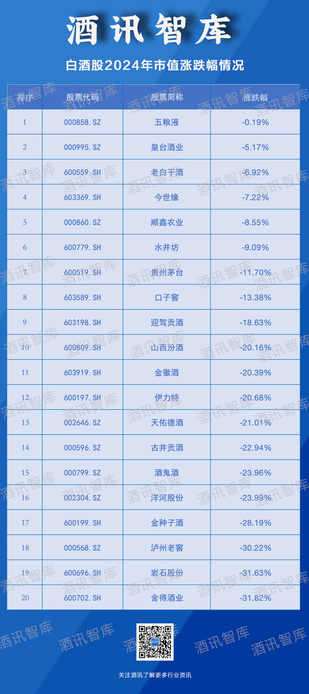 酒讯智库统计了解到,2024年内,A股20只白酒股全部录得区间下跌,跌幅在0.19%-31.82%之间。其中,五粮液跌幅最小,为0.19%;舍得酒业最大,为31.82%。