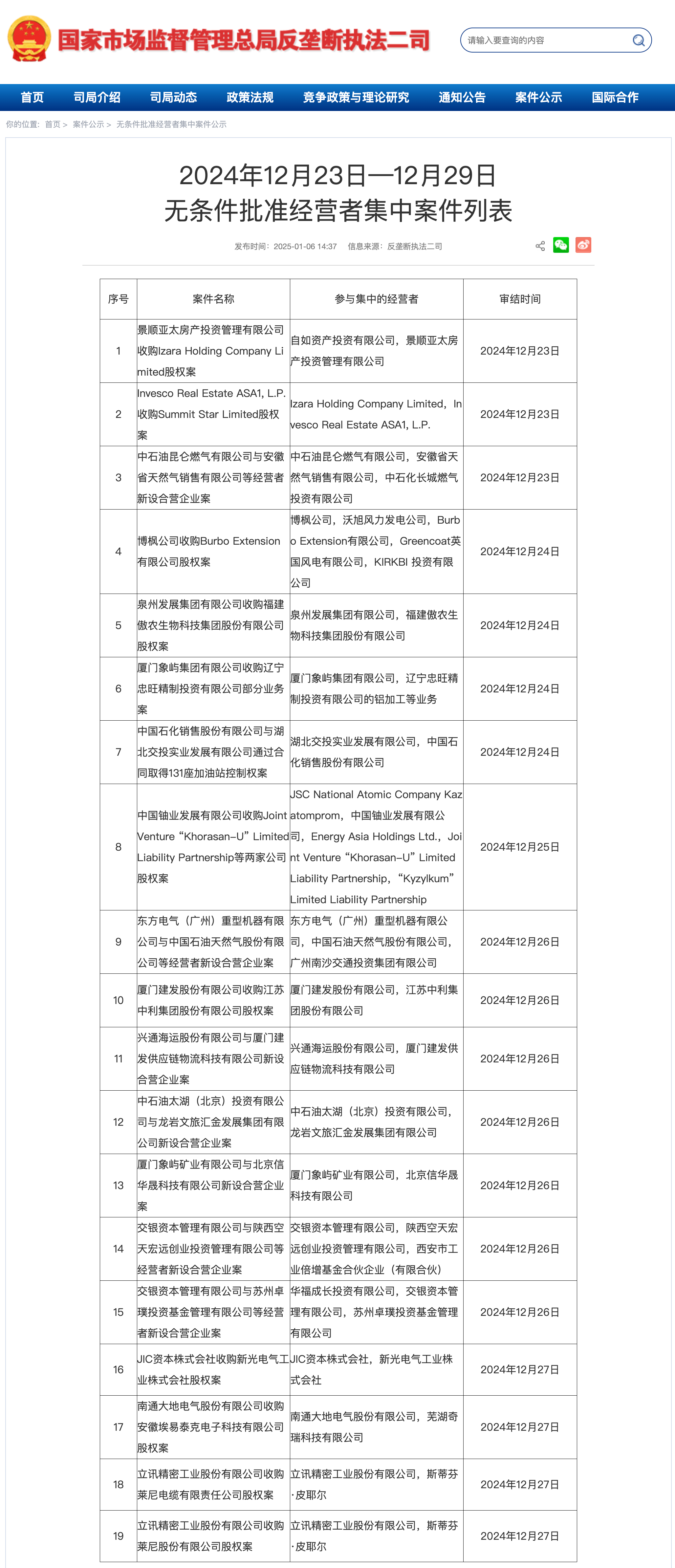 1月6日,市场监管总局发布2024年12月23日—12月29日无条件批准经营者集中案件列表,其中包括立讯精密工业股份有限公司收购莱尼电缆有限责任公司股权案、立讯精密工业股份有限公司收购莱尼股份有限公司股权案。