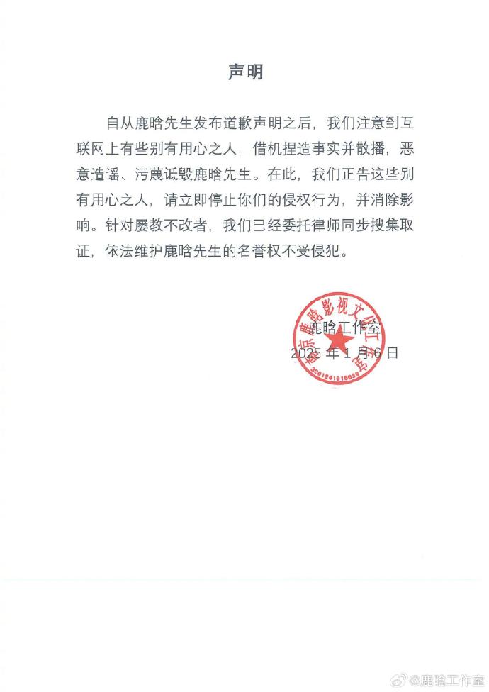 @鹿晗工作室 微博1月6日再次发文称,自从鹿晗发布道歉声明之后,注意到互联网上有些别有用心之人,借机捏造事实并散播,恶意造谣、污蔑诋毁鹿晗先生。“在此,我们正告这些别有用心之人,请立即停止你们的侵权行为,并消除影响。针对屡教不改者,我们已经委托律师同步搜集取证,依法维护鹿晗先生的名誉权不受侵犯。”