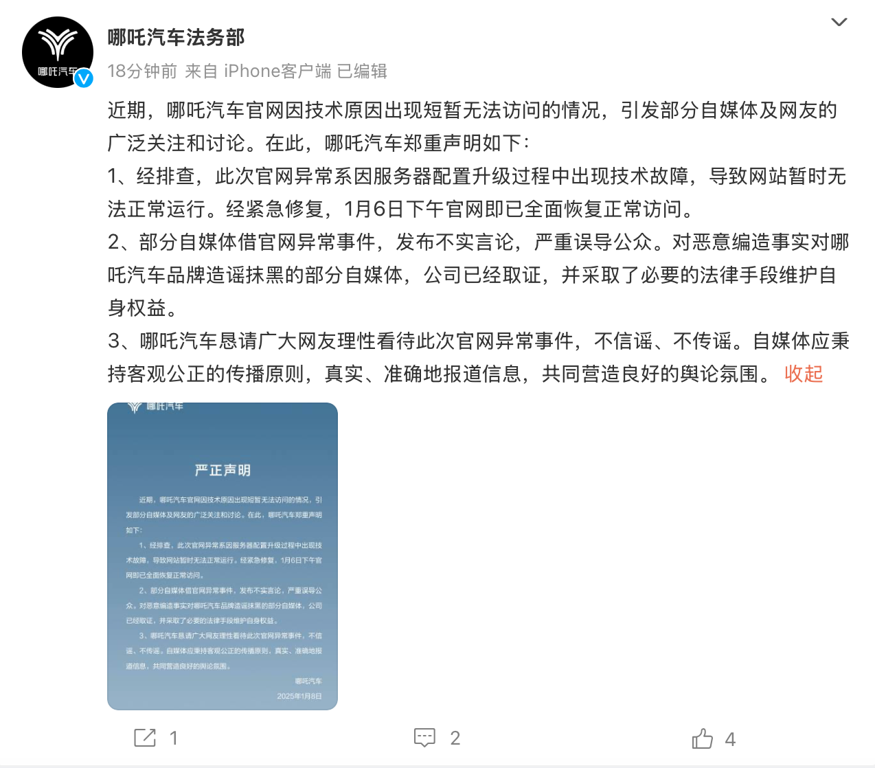 哪吒汽车恳请广大网友理性看待此次官网异常事件,不信谣、不传谣。自媒体应秉持客观公正的传播原则,真实、准确地报道信息,共同营造良好的舆论氛围。