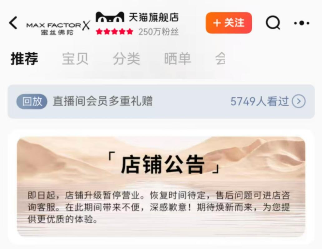 青眼获悉,近日蜜丝佛陀天猫旗舰店主页发布官方公告,称“即日起,店铺升级暂停营业。恢复时间待定,售后问题可进店咨询客服。在此期间带来不便,深感歉意。”