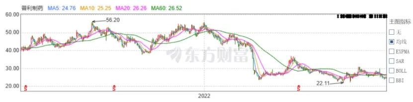 巧合的是,在普利制药出现财务问题的2021年和2022年中,其股价也经历了从历史最高点向下滑落的过程,两年中,其最高价曾达到56.2元/股,最低价达到22.11元/股,二者相比,跌幅超过60%。