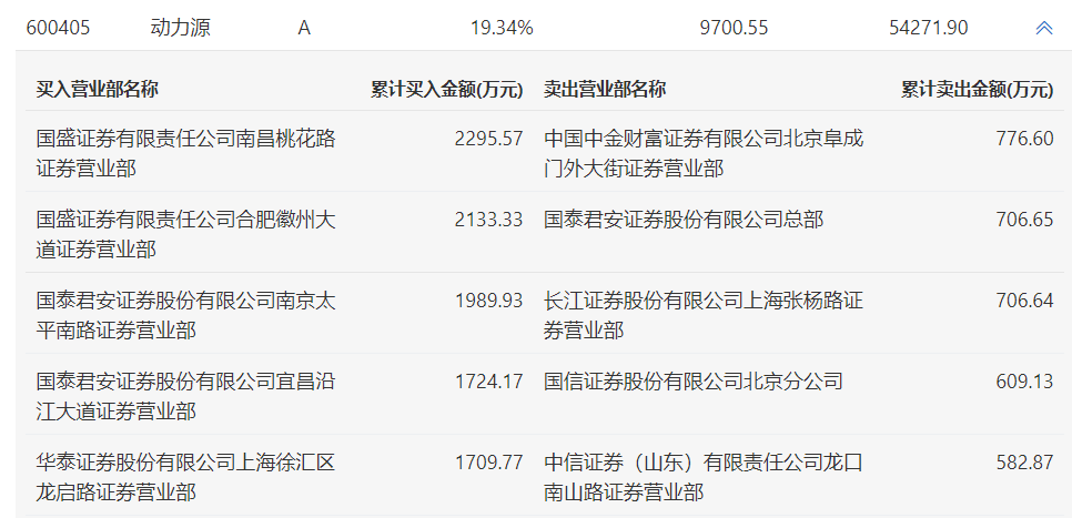 动力源今日涨停,龙虎榜数据显示,上榜营业部席位全天成交1.32亿元,占当日总成交金额比例为24.39%。其中,买入金额为9852.77万元,卖出金额为3381.9万元,合计净买入6470.87万元。