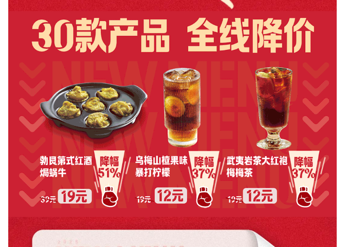 2024年12月2日,必胜客在全国范围内推出2025年全新菜单,其中最让人关注的就是全线30款产品均有不同程度的降价,比如新奥尔良鸡肉意面从39元下调到19.9元,降幅达49%;勃艮第红酒焗蜗牛从39元下调到19元,降幅达51%。