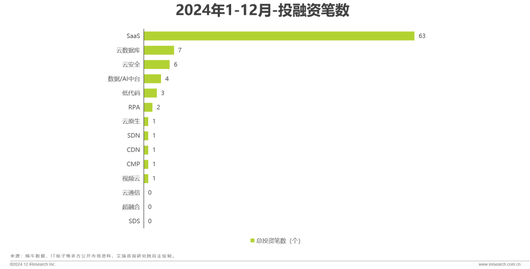 艾瑞观点:12 月各赛道投融资数据中,SaaS赛道新增10笔,2024年全年投融资累计63笔,低代码、云安全、云原生各新增1笔,其余暂无融资动态发生。