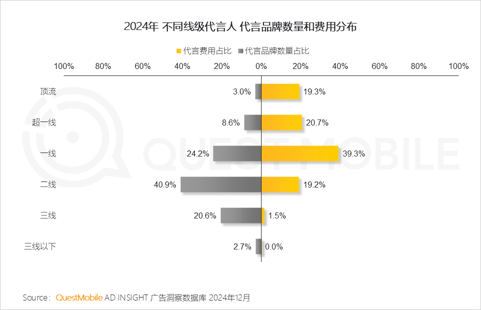 2.2 2024年一线及以上级别代言人占据市场近80%的代言费用,代言营销集中在头部流量特征更为显著