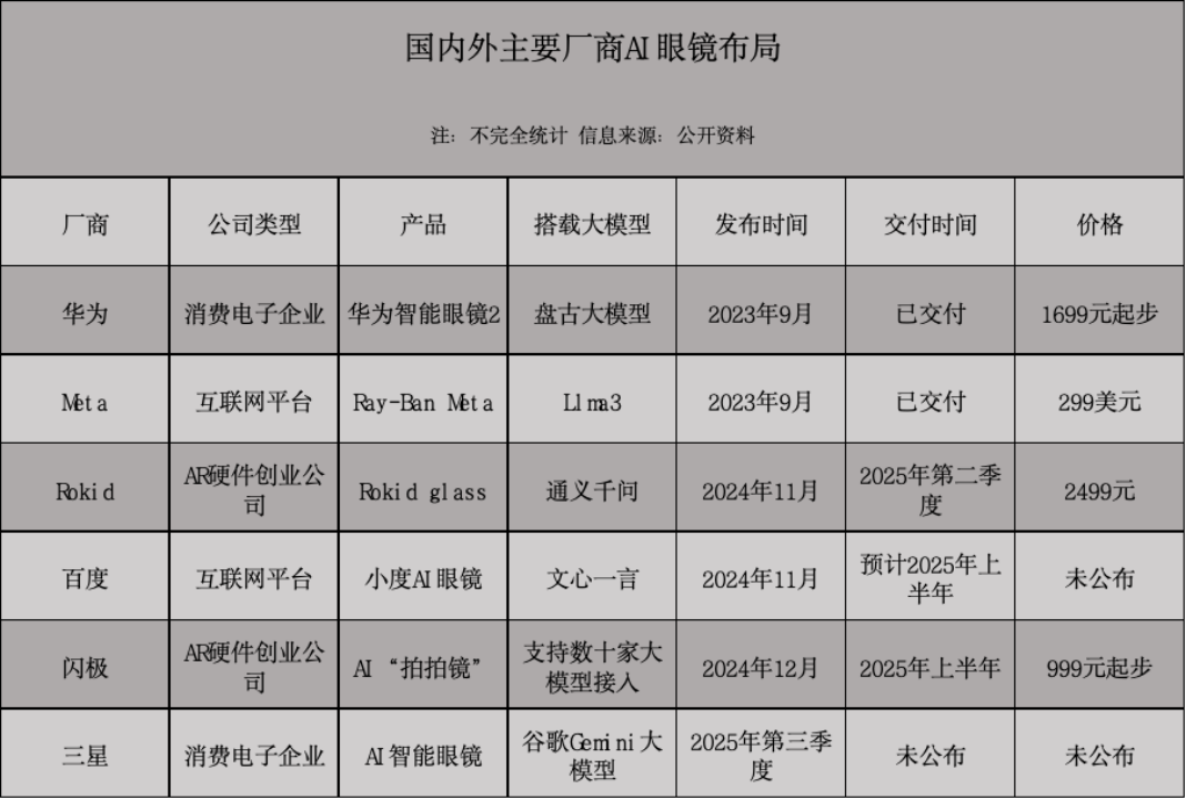 据不完全统计,百度、华为、字节、腾讯、小米、苹果、三星等巨头均已发布或被传筹备AI眼镜,加速推动大模型应用在消费端的落地场景探索。
