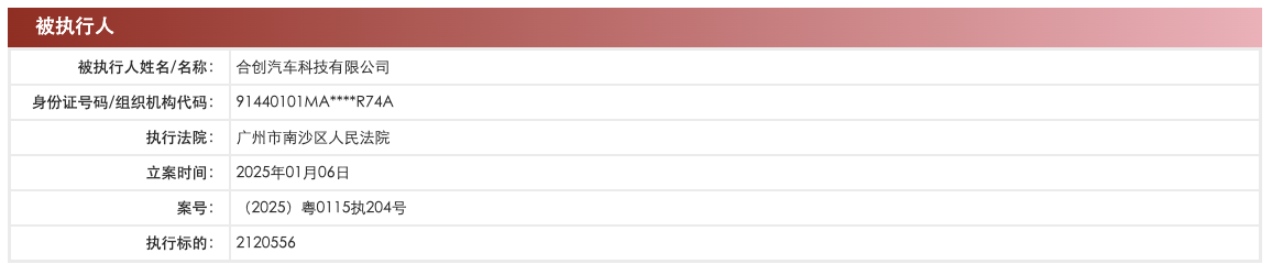 中国执行信息公开网显示,1月6日,合创汽车科技有限公司新增一条被执行人信息,执行标的212万余元,涉及服务合同纠纷案件,执行法院为广州市南沙区人民法院。