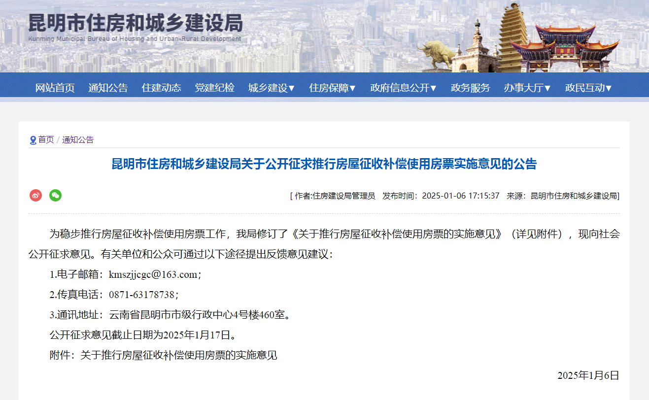 1月6日,昆明市住房和城乡建设局发布了《关于推行房屋征收补偿使用房票的实施意见(征求意见稿)》(以下简称新版)。包含实施范围、房票有效期、房票票面金额结余兑付条件、房票结算等方面都有新的调整。