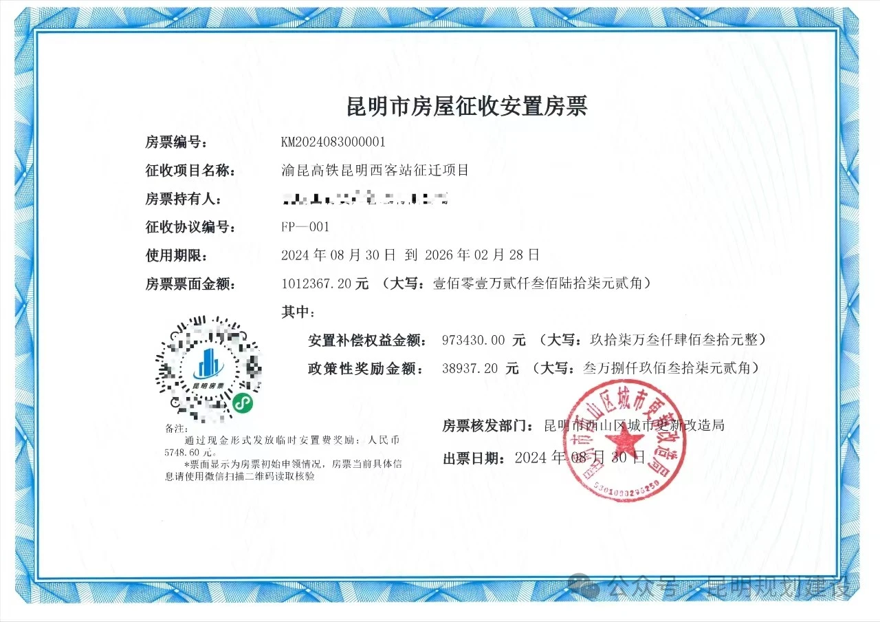 西山区城市更新改造局在渝昆高铁昆明西客站征迁项目核发的第一张房票,已发放的房票凭证载明征收项目名称、房票持有人、房票票面金额及政策性奖励金额、使用期限等信息,票面金额为101万余元。