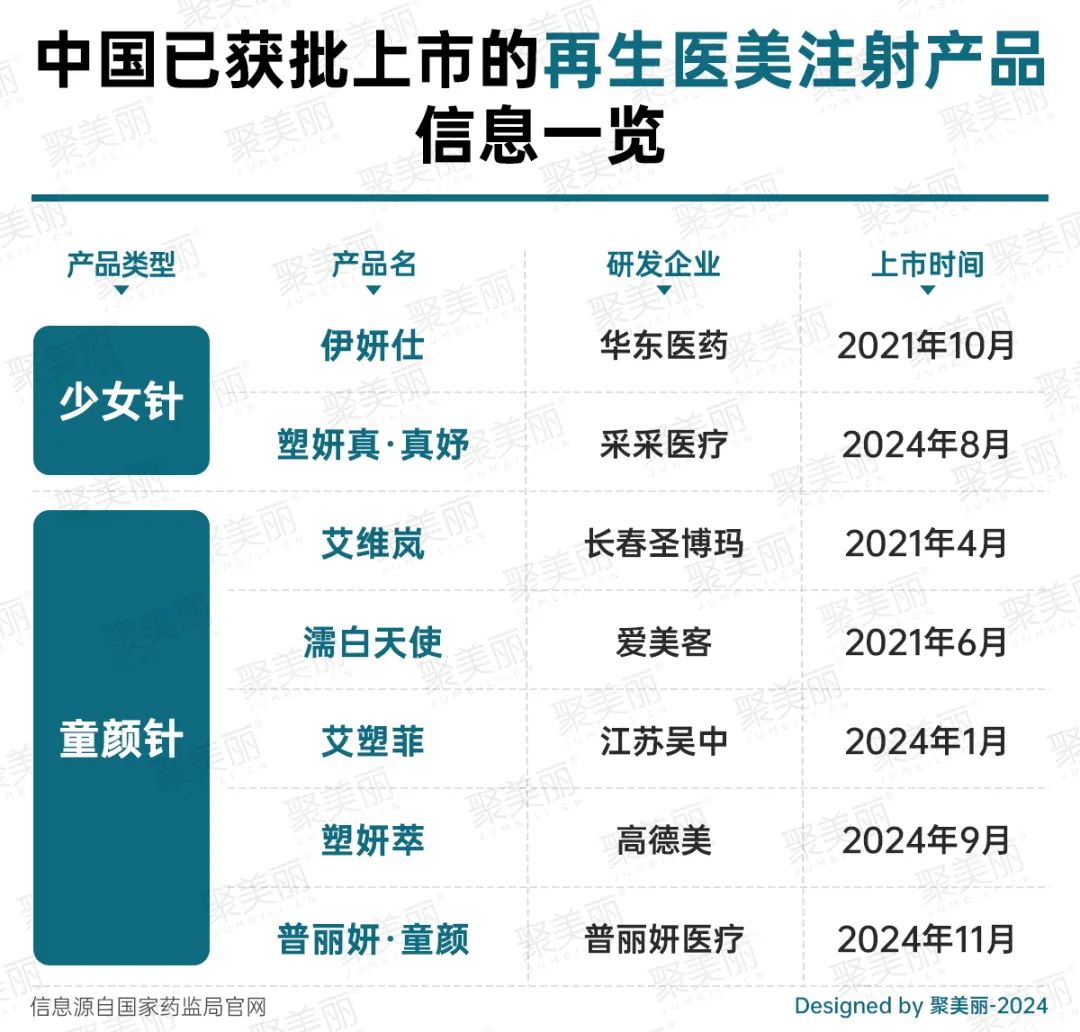 2021年,随着“童颜针”、“少女针”等产品陆续在国内获批上市,截至目前国内已拿到注册证的医美再生注射类产品累计有7款,仅今年就获批了4款。