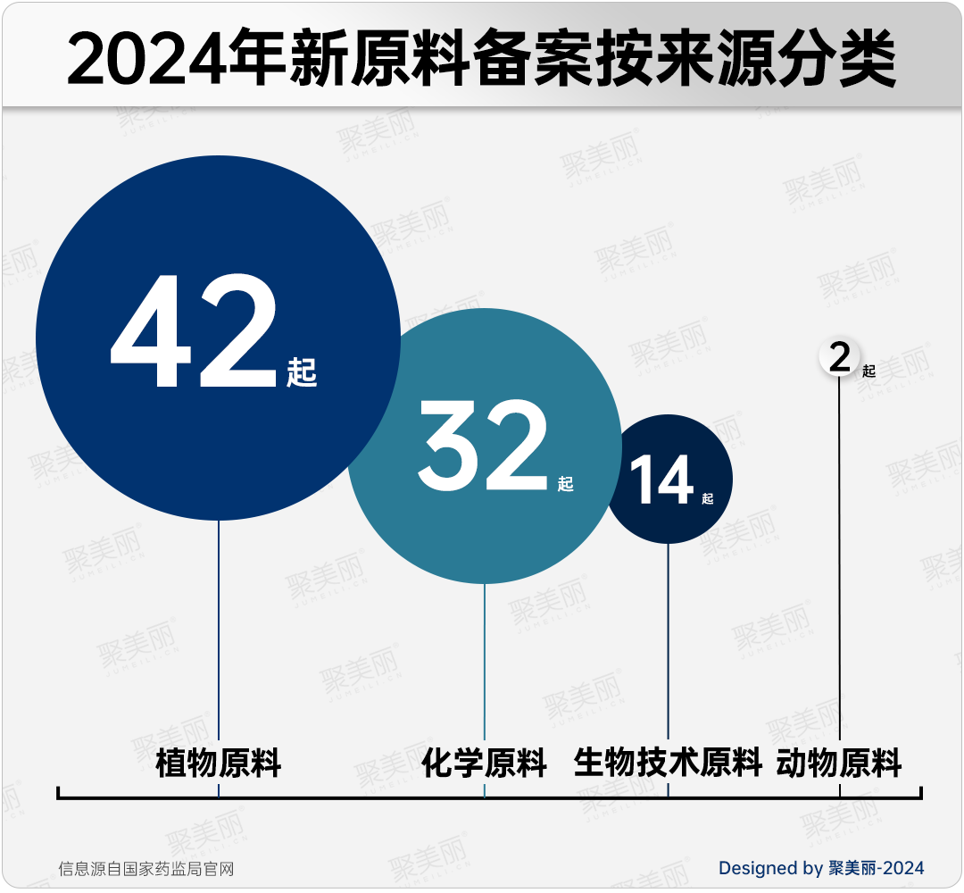 而在2024年备案的90个新原料中,植物原料的备案数从2023年的12个翻了三倍多,增至42个,一举抢占了化学原料的主导地位。反观化学原料,其主导地位已有所减弱,目前备案数仅有32个,生物技术原料和动物原料分别是14个和2个。