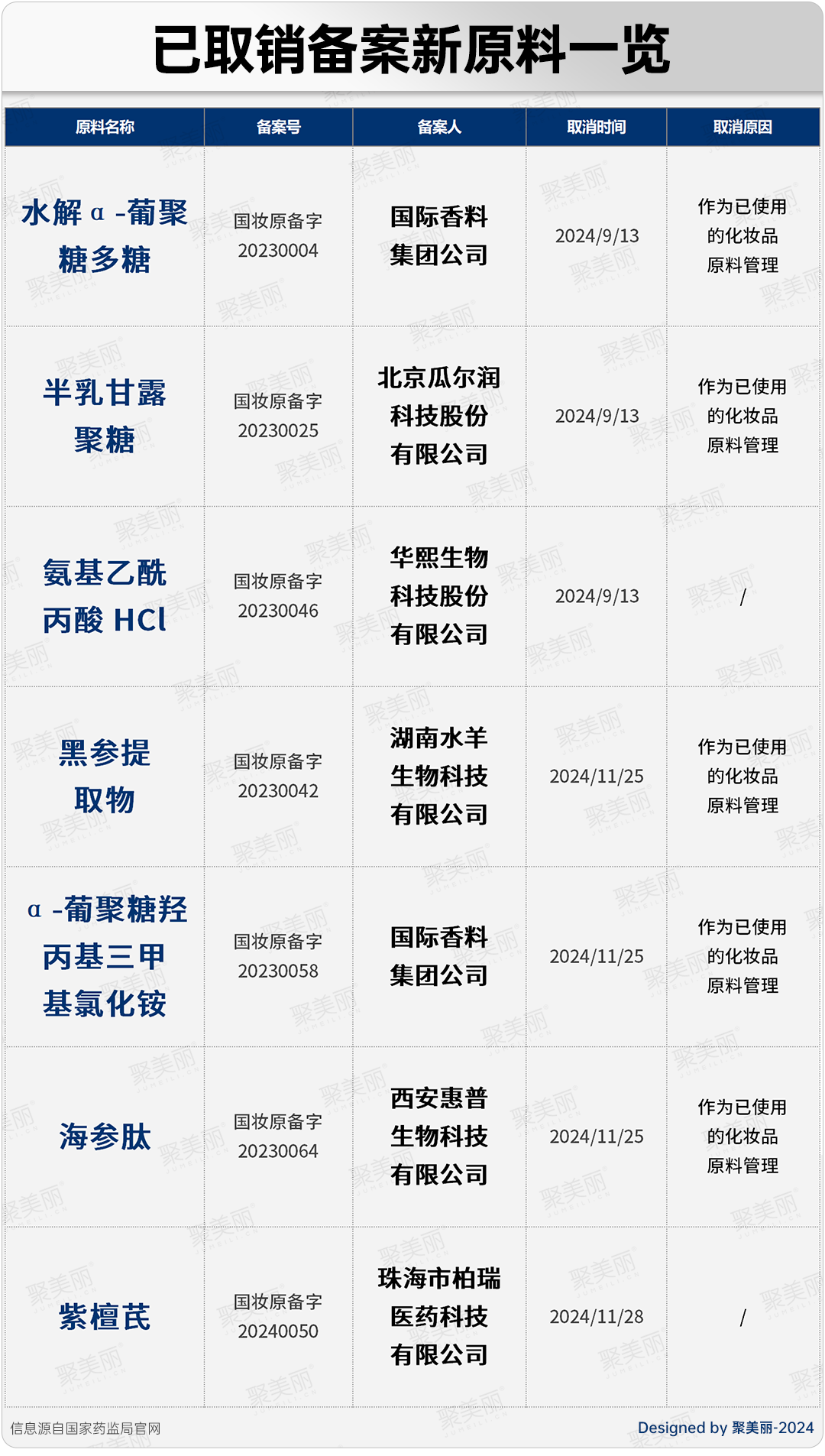 而已取消备案的7个新原料则分别为,2023年备案的新原料——水解α-葡聚糖多糖、半乳甘露聚糖、氨基乙酰丙酸 HCl、黑参提取物、α-葡聚糖羟丙基三甲基氯化铵、海参肽;2024年备案的新原料——紫檀芪。