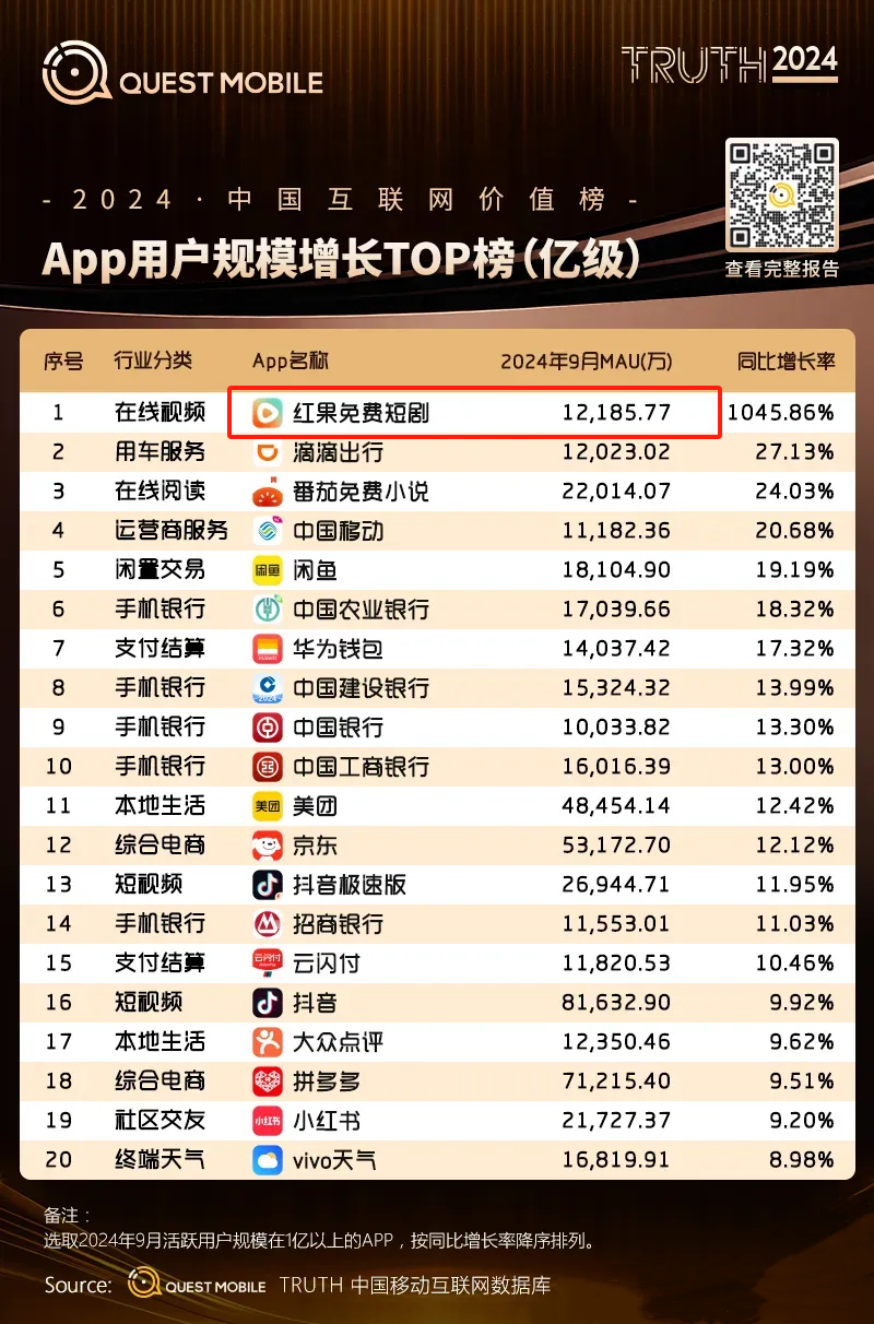 QuestMobile发布的数据显示,2024年3月,红果短剧以5400万的月活跃用户数位列在线视频行业第六。今年9月,该平台月活跃用户增至1.2亿,同比增长1045.9%,稳居行业第一;11月,红果短剧月活更是突破1.4亿。
