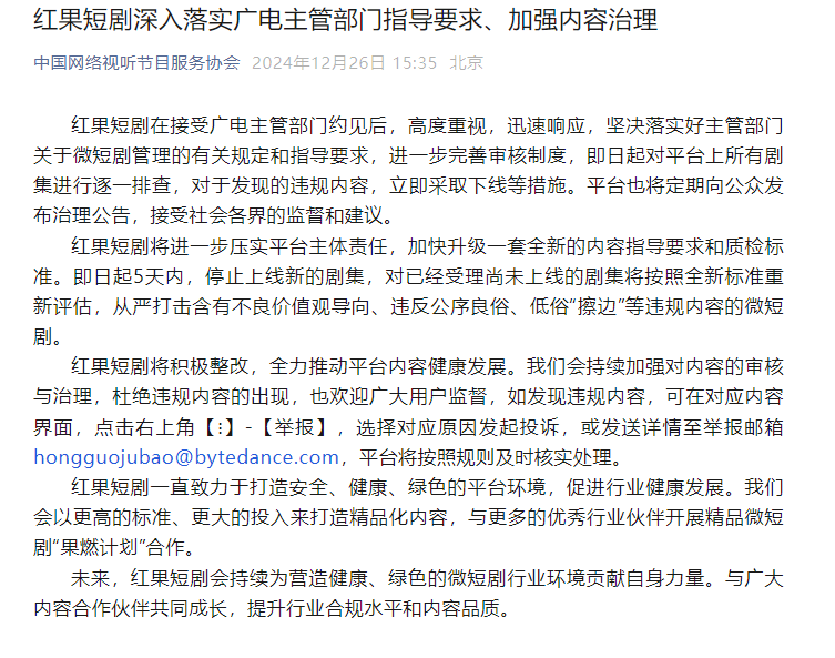 12月25日,广电总局网络视听司、北京市广电局联合约见红果短剧主要负责人,对其微短剧规范发展提出要求。