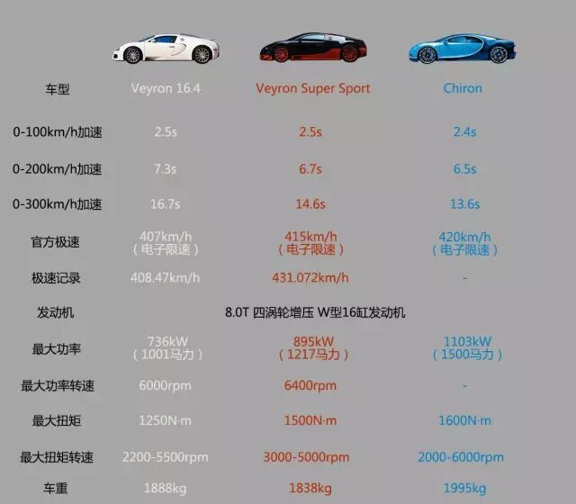 随后出现进化版Veyron Super Sport,极速已达到415km/h,功率和扭矩都大幅度上升。
