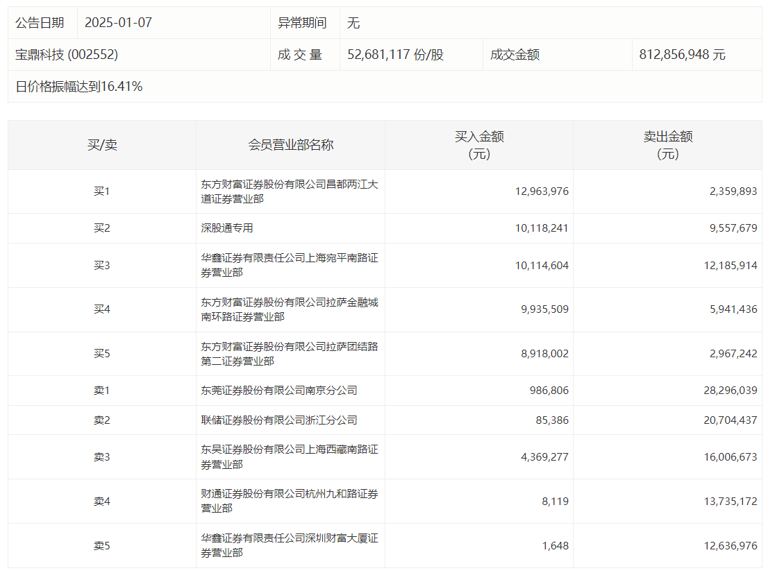 宝鼎科技今日跌3.83%,龙虎榜数据显示,上榜营业部席位全天成交1.82亿元,占当日总成交金额比例为22.38%。其中,买入金额为5750.16万元,卖出金额为1.24亿元,合计净卖出6688.99万元。