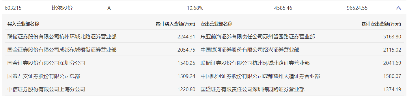 比依股份今日跌停,龙虎榜数据显示,上榜营业部席位全天成交2.08亿元,占当日总成交金额比例为21.59%。其中,买入金额为8569.36万元,卖出金额为1.23亿元,合计净卖出3705.4万元。