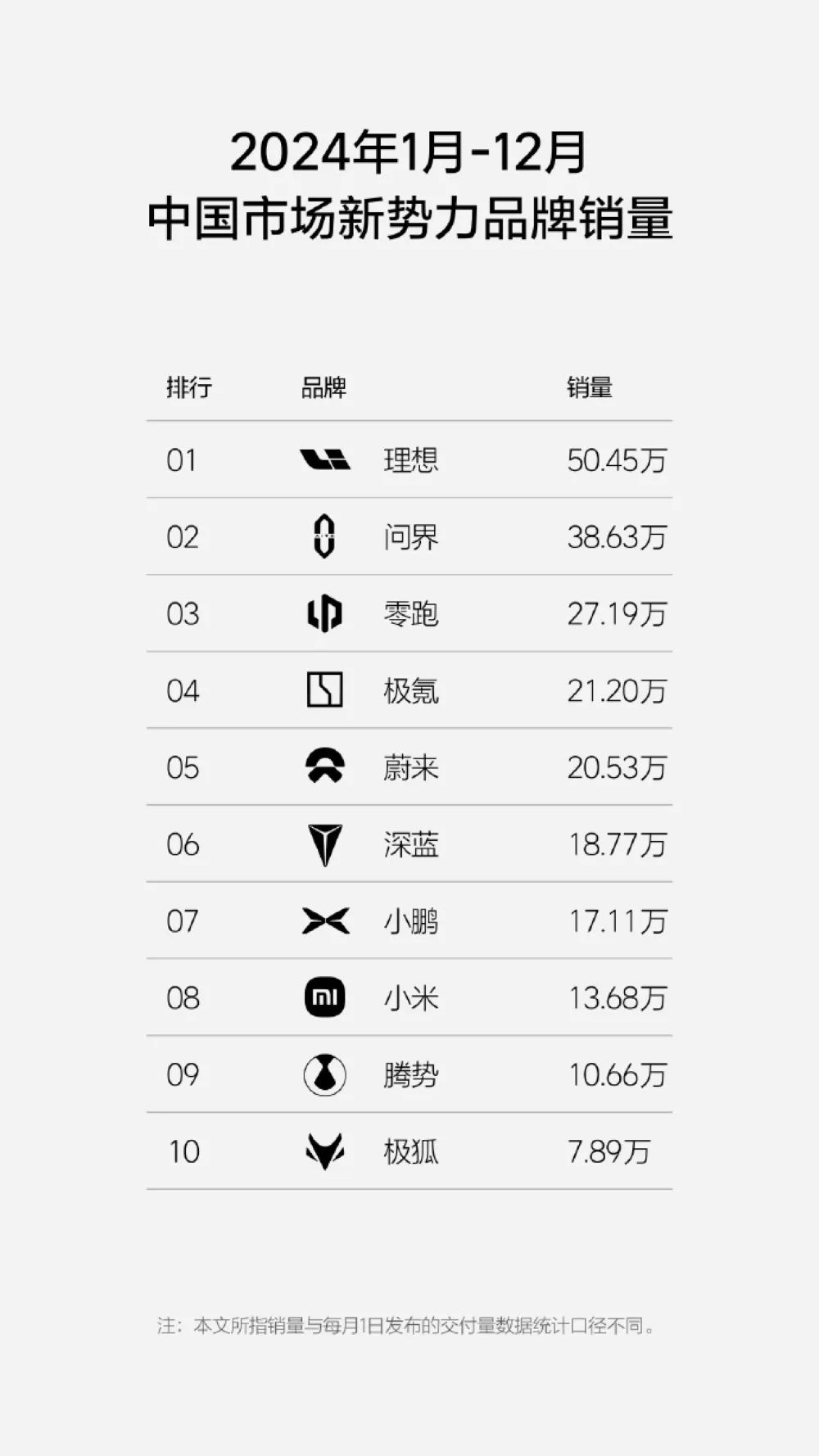 根据理想汽车发布的2024年1月-12月中国市场新势力品牌销量榜来看,理想汽车年度销量50.45万辆,获中国市场新势力品牌销量第一。