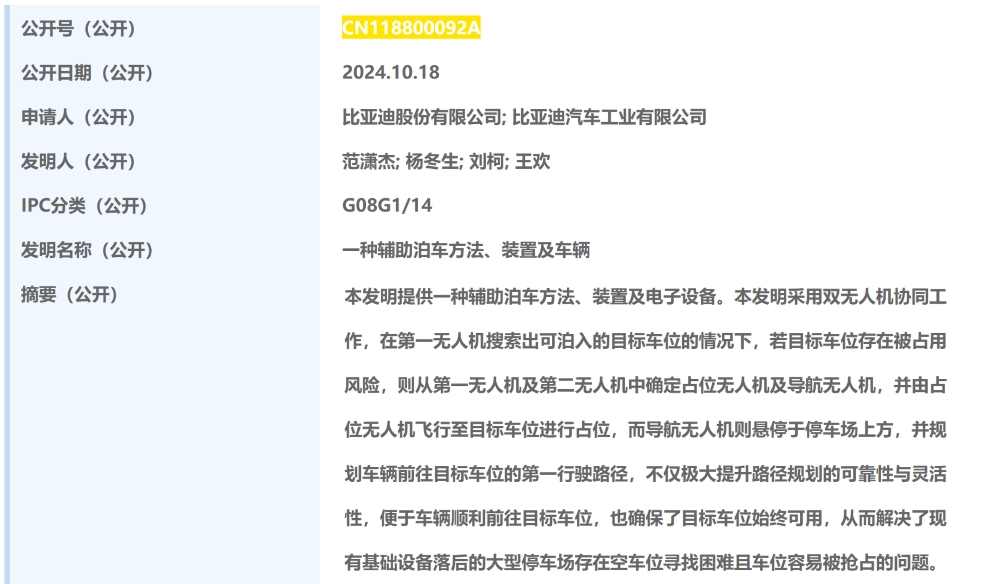 在2024年10月18日,比亚迪一项专利号为CN118800092A的专利公开,提到了一种辅助泊车的方法。