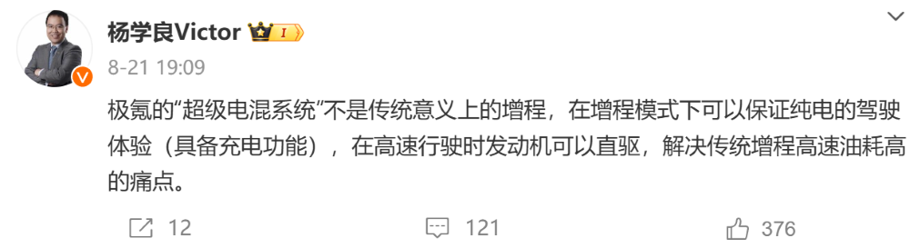 同时,吉利控股集团高级副总裁杨学良在社交平台上表示,极氪的“超级电混系统”不是传统意义上的增程,在增程模式下可以保证纯电的驾驶体验(具备充电功能),在高速行驶时发动机可以直驱。
