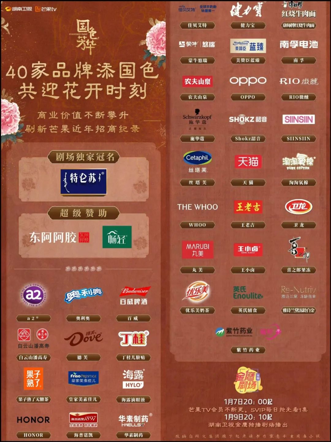 另一重更具含金量的表现是,《国色芳华》为湖南卫视金鹰独播剧场赢得了特伦苏的剧场独家冠名,也为自己赢得了东阿阿胶、畅轻的超级赞助。