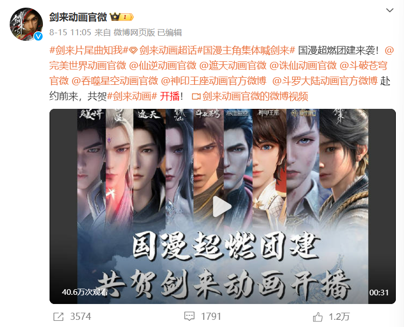动画开播前就有纵横小说、七猫小说、腾讯视频共同发起的预约活动,平台几部年番主角在各自动画里喊出“剑来”造势,尽可能多地吸引书粉和潜在观众。