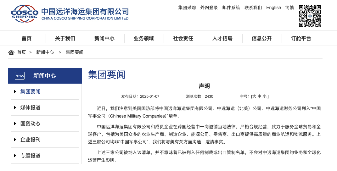 1月7日,中国远洋海运集团发布声明称,近日注意到美国国防部将中国远洋海运集团有限公司、中远海运(北美)公司、中远海运财务公司列入“中国军事公司(Chinese Military Companies)”清单。上述三家公司均非“中国军事公司”,公司将与美有关方面沟通,澄清事实。上述三家公司被纳入该清单,并不意味着已被列入任何制裁或出口管制名单,不会对中远海运集团的业务和全球化运营产生影响。