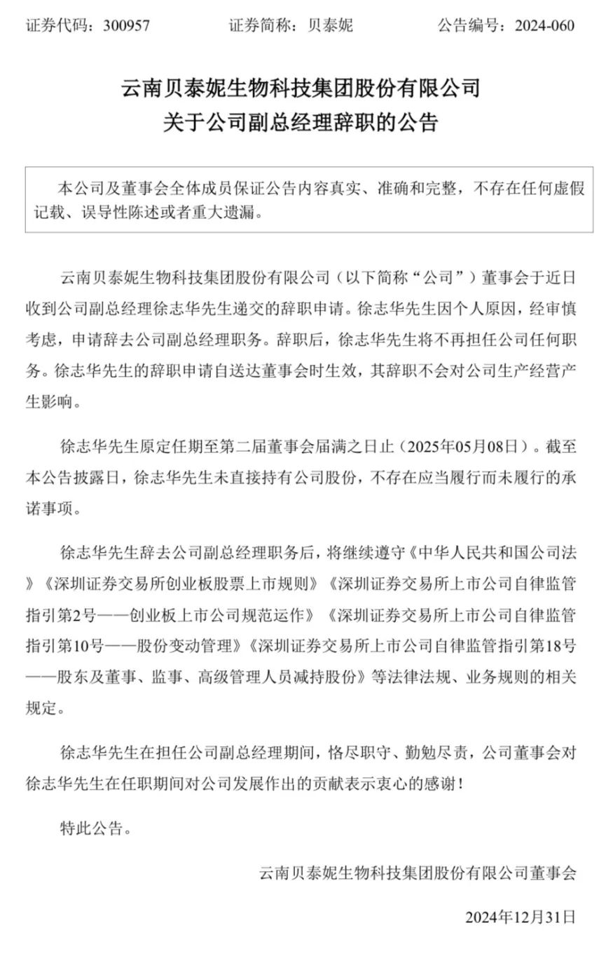 2024年12月31日,贝泰妮副总经理徐志华因个人原因,辞去公司职务。据公开资料,徐志华于2023年10月加入贝泰妮集团,任公司总裁营销助理,并于2024年4月升任贝泰妮副总经理。徐志华在贝泰妮担任副总经理的时间仅为短短的8个月左右。