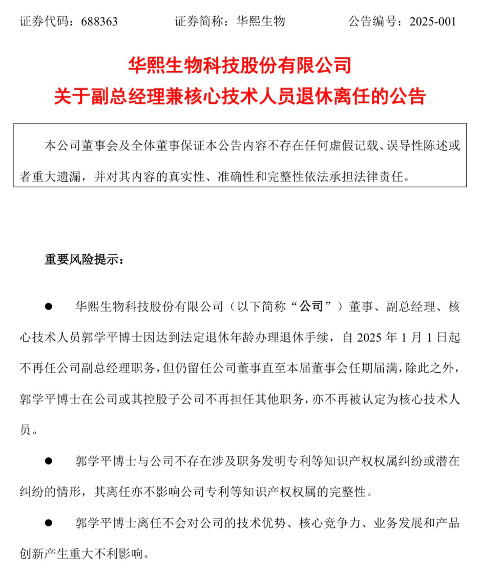 无独有偶,2025年伊始,华熙生物公司核心技术人员郭学平博士退休,自2025年1月1日起不再任公司副总经理职务,同时其在公司或控股子公司不再担任其他职务,亦不再被认定为核心技术人员。