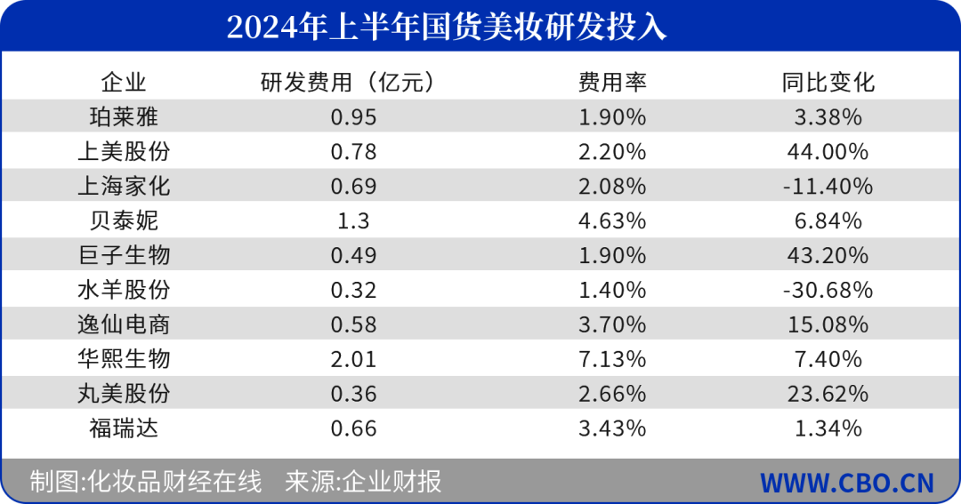 当品牌回归产品品质本身,科研投入成为了绕不开的话题。科研创新往往能帮助国货美妆增强品牌在技术和产品差异化方面的竞争力,因此,美妆品牌对于产品研发的重视度越来越高。据CBO统计,仅2024年上半年,十家企业总研发投入已达8.14亿元,赶超2020年全年。