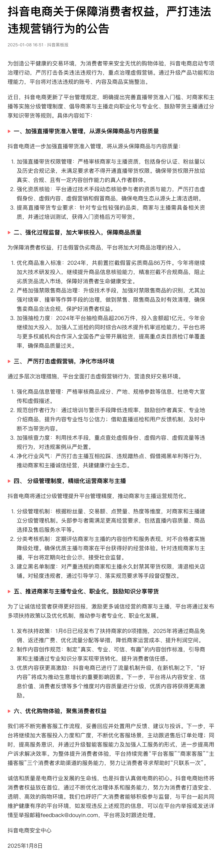 1月8日,抖音电商安全中心发布公告称,抖音电商启动专项治理行动,严厉打击各类违法违规行为,重点治理虚假营销。此外,抖音电商更新了平台管理规定,明确提出完善直播带货准入门槛、对商家和主播等实施分级管理制度、倡导商家与主播走向职业化与专业化、鼓励带货主播通过分享知识带货等规则。抖音电商表示,将进一步加强直播带货准入管理,确保带货权限开放给真实、合规、且有一定内容创作能力的真人作者群体。针对专业性较强的品类,商家与主播需具备相关资质,并通过培训测试,获得入门资格后方可带货。