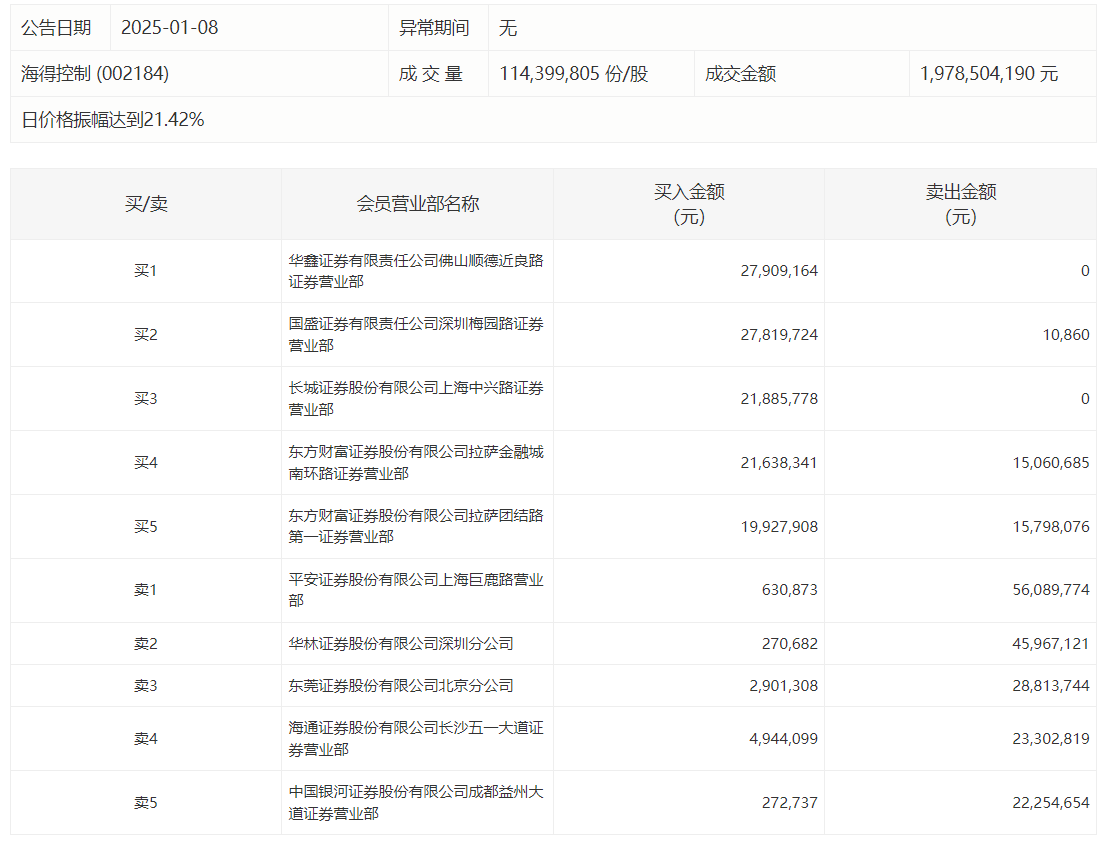 海得控制今日涨停,龙虎榜数据显示,上榜营业部席位全天成交3.35亿元,占当日总成交金额比例为16.96%。其中,买入金额为1.28亿元,卖出金额为2.07亿元,合计净卖出7909.71万元。