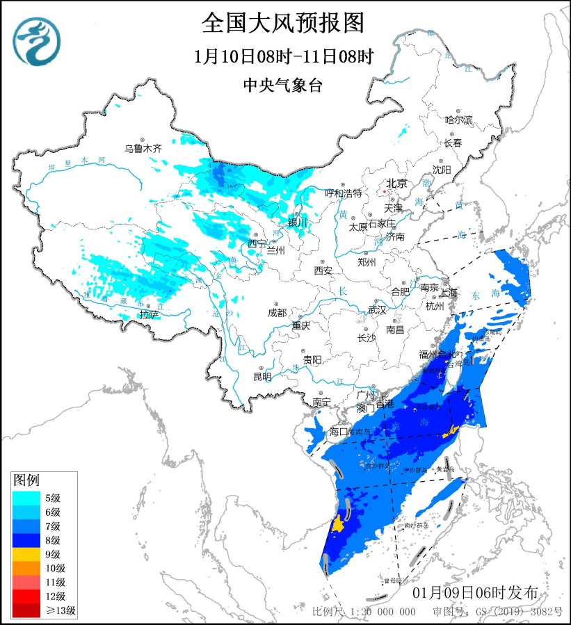 预计,1月9日08时至10日08时,新疆东部、西藏大部、青海西南部、川西高原、内蒙古东南部和西北部、山东半岛、辽东半岛、江苏沿海等地有5~6级、阵风7~8级的大风;渤海、渤海海峡、黄海大部海域、东海大部海域、台湾海峡、台湾以东洋面、巴士海峡、北部湾、南海大部海域将有7~8级、阵风9级的大风,其中台湾海峡部分海域风力可达9级、阵风10级。