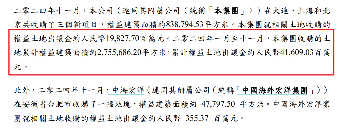 根据最新披露的数据,2024年1-11月,中国海外发展收购的土地累计权益建筑面积约为276万平方米,累计权益土地出让金约为416亿元,拿地资金远超同期经营性现金流入净额。