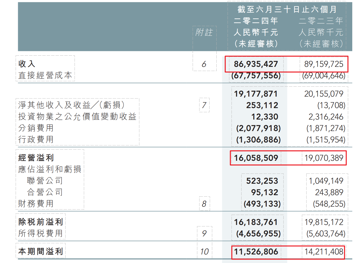 根据2024年中报,公司上半年确认收入约为869亿元,同比下降约2%,净利润约为115亿元,同比下降约19%。
