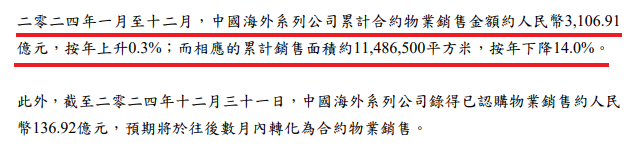 1月7日,中国海外发展(00688.HK)发布公告,2024年1—12月,累计合约物业销售金额约3107亿元,同比上升0.3%;而相应的累计销售面积约1149万平方米,同比下降14%。