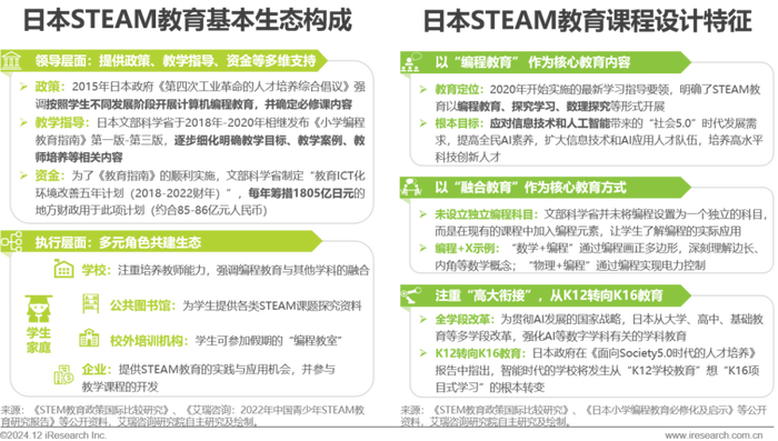 日本的STEAM教育起步较晚,直到2010年才出现在日本“第四次科学技术基本计划”等国家战略中,因此日本STEAM教育的政策制定、教学理念、课程设计等均与促进信息技术、人工智能的发展高度相关。日本的STEAM教育基本生态由政府、学校、公共图书馆、校外培训机构、社会企业等多元角色构成。日本STEAM教育课程设计主要遵从“以编程教育为核心内容,以融合教育为核心方式,注重高大衔接”等理念。考虑到开展年限较短、公立机构推广为主等特性,本次报告中并未给出日本企业的案例介绍。