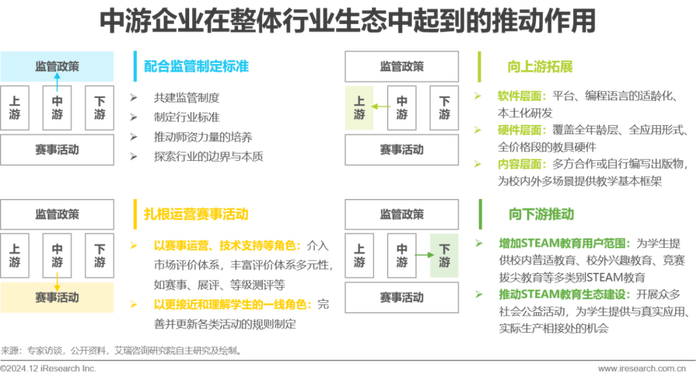 2017年由中国教育科学研究院发布的《中国STEM教育白皮书》中曾提及,STEM在中国的兴起更多的是国家大政策趋势下的草根行为,各类STEM产品公司率先推出产品并逐步开展相关教育活动,以推动STEM教育在整个社会中的发展。时至今日,中游企业在我国STEAM教育产业中的占位,依旧是将教育部门、教育专家、教师、各行业伙伴等多元角色进行整合凝聚的角色,其向上能够配合建设监管制度与行业标准,向下能够扎根运营各类赛事活动,向上游拓展研发软硬件与出版内容,向下游推动STEAM教育理念在广大学生中的理念传播,构建并持续完善STEAM教育新生态。