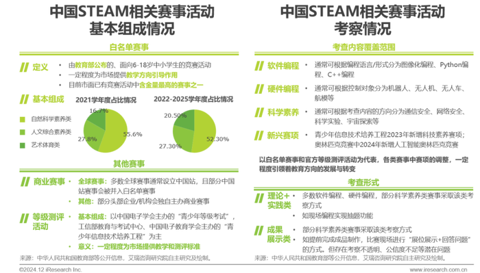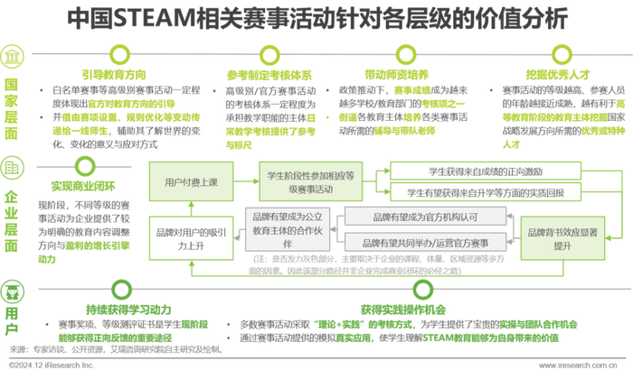 各类赛事活动的奖项、证书是是现阶段我国STEAM教育最大的成果检验出口,因此也成为保障STEAM教育健康且持续发展的基石。在国家层面,赛事活动一定程度是官方对教育方向倡导的意志化身,因此在宏观上起到了教育方向引导、师资培养带动等作用。在企业层面上,赛事活动成为商业闭环的重要环节,为企业提供了盈利增长的引擎。在用户层面,赛事活动为学生提供了最为直接的激励与正向反馈,同时也在现有教育体制下,为学生提供了宝贵的实践与接触真实产业发展的机会。