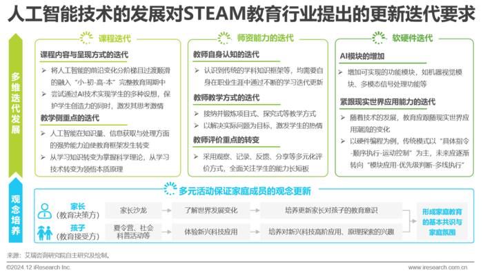 随着人工智能的发展,社会对孩子的要求日新月异,行业与用户都需要持续迭代更新与时俱进。首先在基层建设上,家长与孩子应尽力参加多元活动保证家庭成员的观念更新,在家庭内部形成重视新兴科技与原理探索等教育理念的基本共识。其次整体社会与企业应同步在课程、师资能力、软硬件等多维度迭代发展,保证社会需求、学校/机构培养、家庭处于同步进步的节奏中。