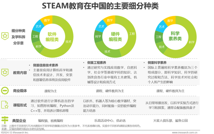 STEAM教育实践中按教育侧重点不同,主要分为软件编程、硬件编程和科学素养类,同一机构往往同时开设多类课程