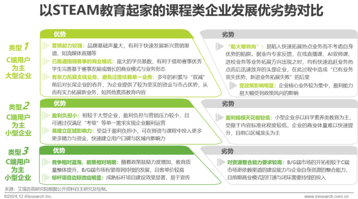 目前STEAM教育行业中能够以课程为主要业务且顺利发展的企业根据业务起点起点可分为两大类,分别是“以STEAM教育起家”和“将教育范围逐步拓展至STEAM教育领域”的企业。其中前者企业根据用户类型和营收能力进一步细分为三类,第一类是C端用户为主的大型企业,该类企业成立视角较早,但如果始终保持单一业务的话未来存在转向困难的风险;第二类是C端用户为主的小型企业,该类企业盈利负担小且较容易在某区域内建立较高的影响力,但企业发展天花板受限;第三类是B/G端用户为主的企业,该类企业目前处于蓝海竞争期,用户类型决定了该类业务对企业资源整合能力要求较高,但成功标杆项目具有明显的边际效应。