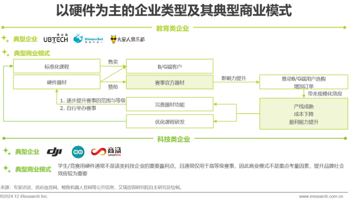 目前市面上主要存在两类企业以STEAM教育相关硬件作为主要业务的企业,第一类是教育类企业,典型代表包括但不限于优必选、鲸鱼机器人、火星俱乐部,其通过赞助等方式成为大型赛事的官方器材供应商,从而大幅提升自身品牌影响力,推动B/G端大客户购买产品,在此过程中逐步完善产线能力并降低成本,并逐步提升赞助赛事等级或开始自行举办赛事成为商业模式的闭环;第二类是科技类企业,典型代表包括但不限于大疆、Arduino、商汤,但学生/竞赛用硬件并非该类企业的重要赢利点,且通常仅用于高等级赛事或高校类赛事,因此在本次报告中不进行详细分析。