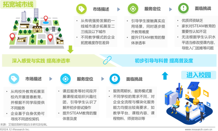 STEAM教育企业除了继续发展企业自身的课程或硬件的核心业务之外,一方面可以进一步激发已有业务的能力上限,如寻找行业内业务互补的合作伙伴,在教育场景、用户年龄、产品研发等维度寻求合作机会;另一方面可以尝试围绕核心STEAM教育业务拓展新鲜业务,如研学业务,从内容、用户、营收等维度实现业务升级。