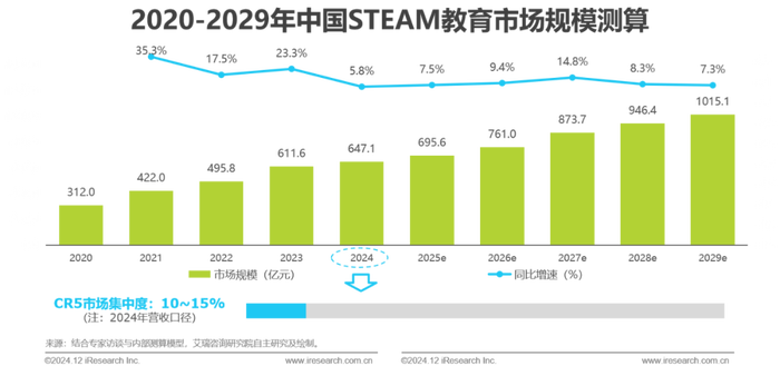 2024年中国STEAM教育市场规模约为647.1亿元人民币,其中CR5市场集中度约为10-15%。2029年中国STEAM教育市场规模预计增长至1015.1亿元人民币