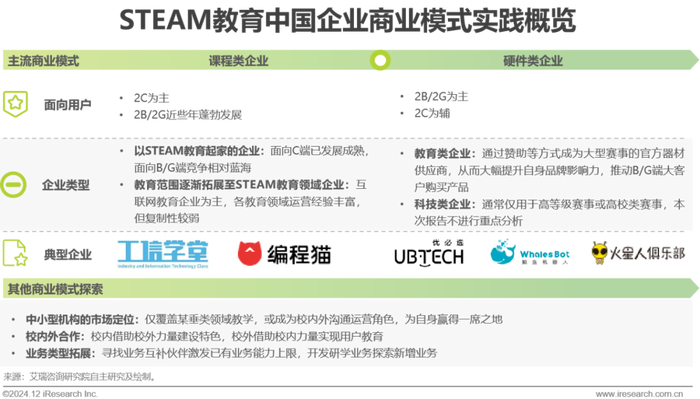 课程与硬件是主流盈利渠道,中小型机构市场定位、校内外合作、拓展业务类型为企业提供新的商业模式思路