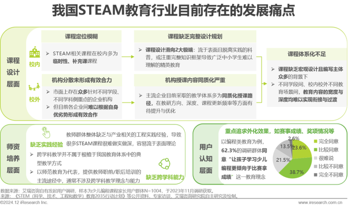 虽然我国STEAM教育目前积极追赶时代发展,但在现有生态下,依旧在课程、师资、用户认知等层面存在着众多发展痛点。首先课程设计层面,校内STEAM相关课程多为临时或补充性课程,课程缺乏完整设计规划,与此同时校外机构间授课内容存在高度同质化的问题,双重发展下导致目前我国的STEAM课程资源整体体系化不足。其次师资培养层面上,教师群体普遍缺乏实践经验与跨学科教学的能力,导致课堂容易流于表面。最后用户认知层面,虽然素质教育理念推广至今已经历数十年,但用户依旧普遍存在重点追求赛事成绩等外化效果的问题。